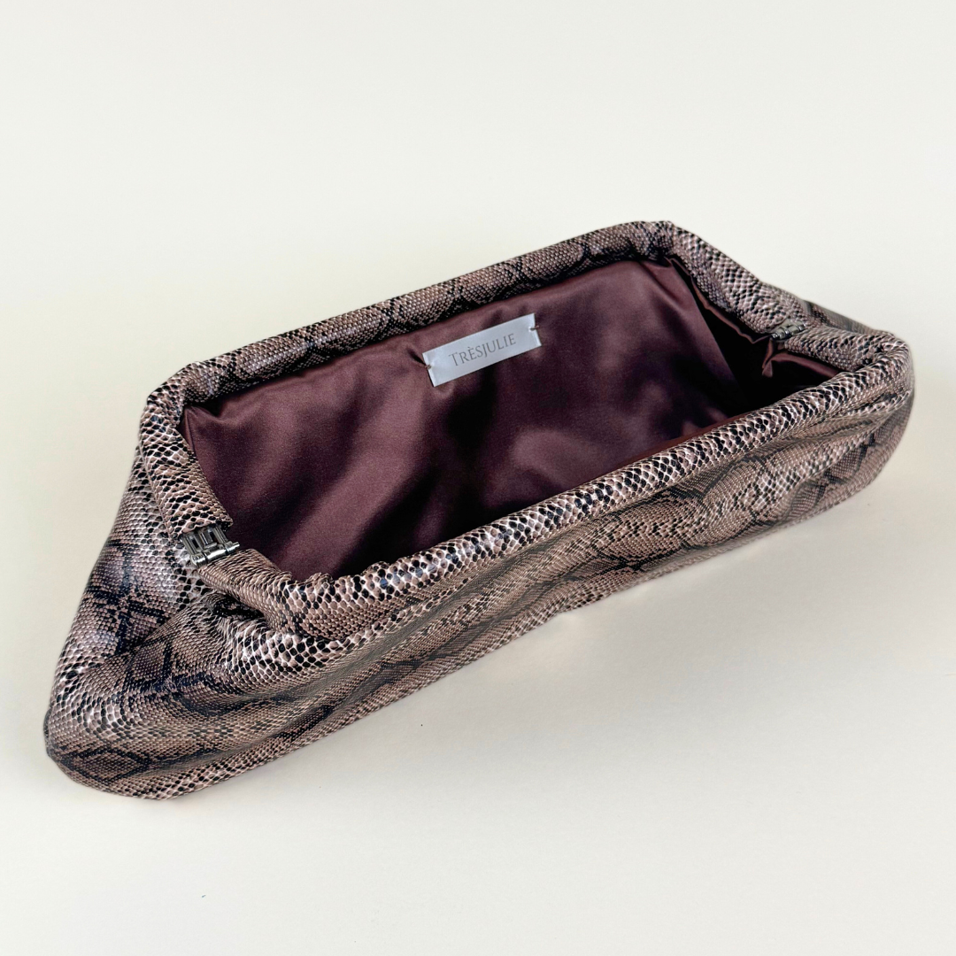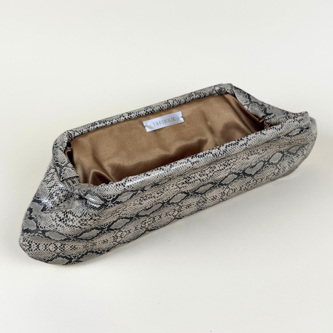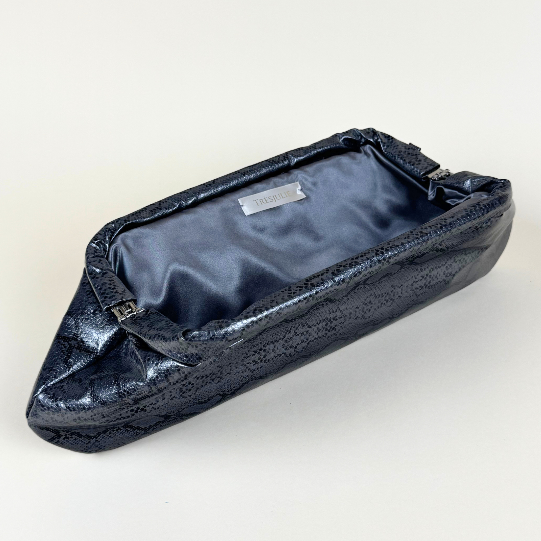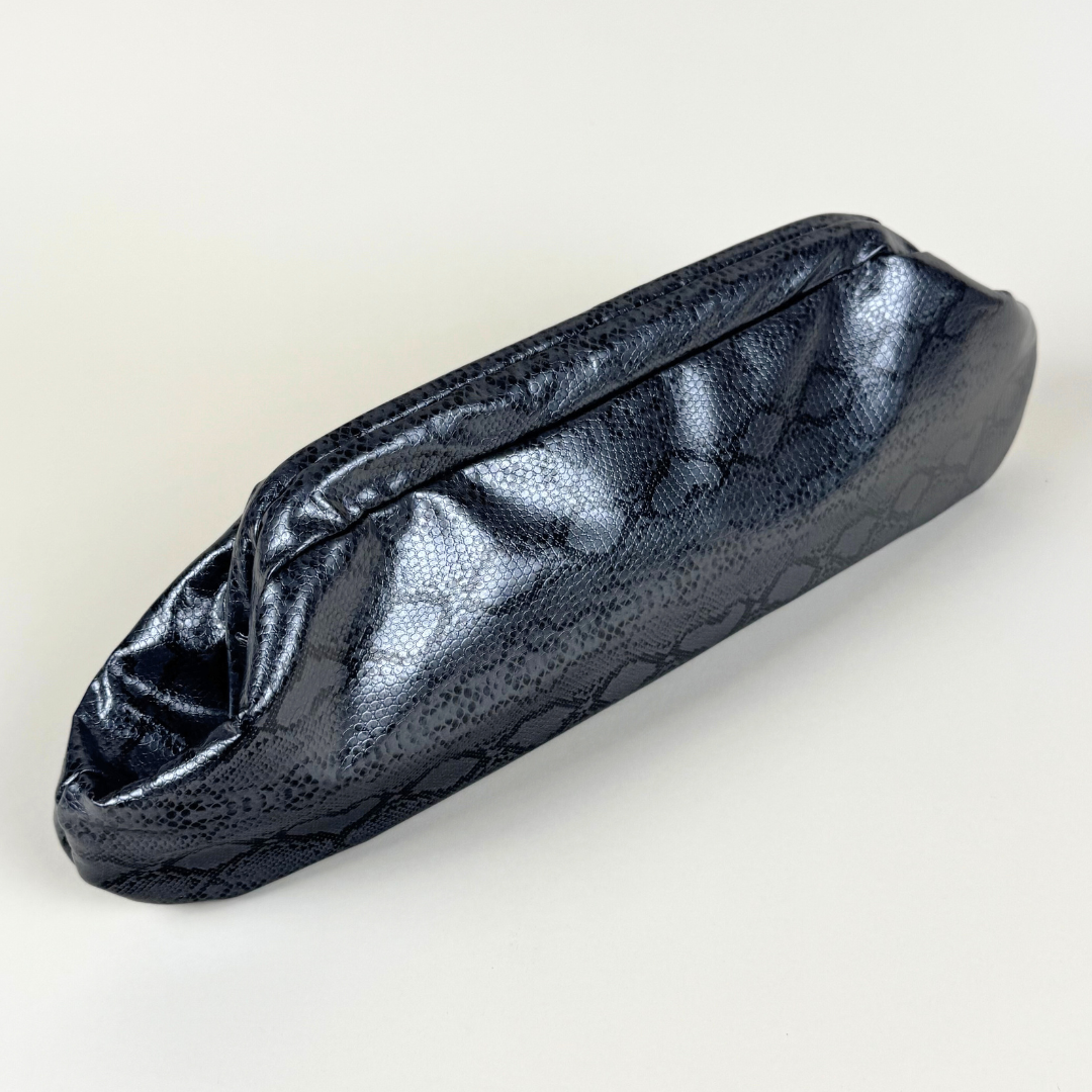 La Baguette Snake è un modello clutch dalla silhouette allungata. Realizzata con un tessuto in Ecopelle stampa Serpente.